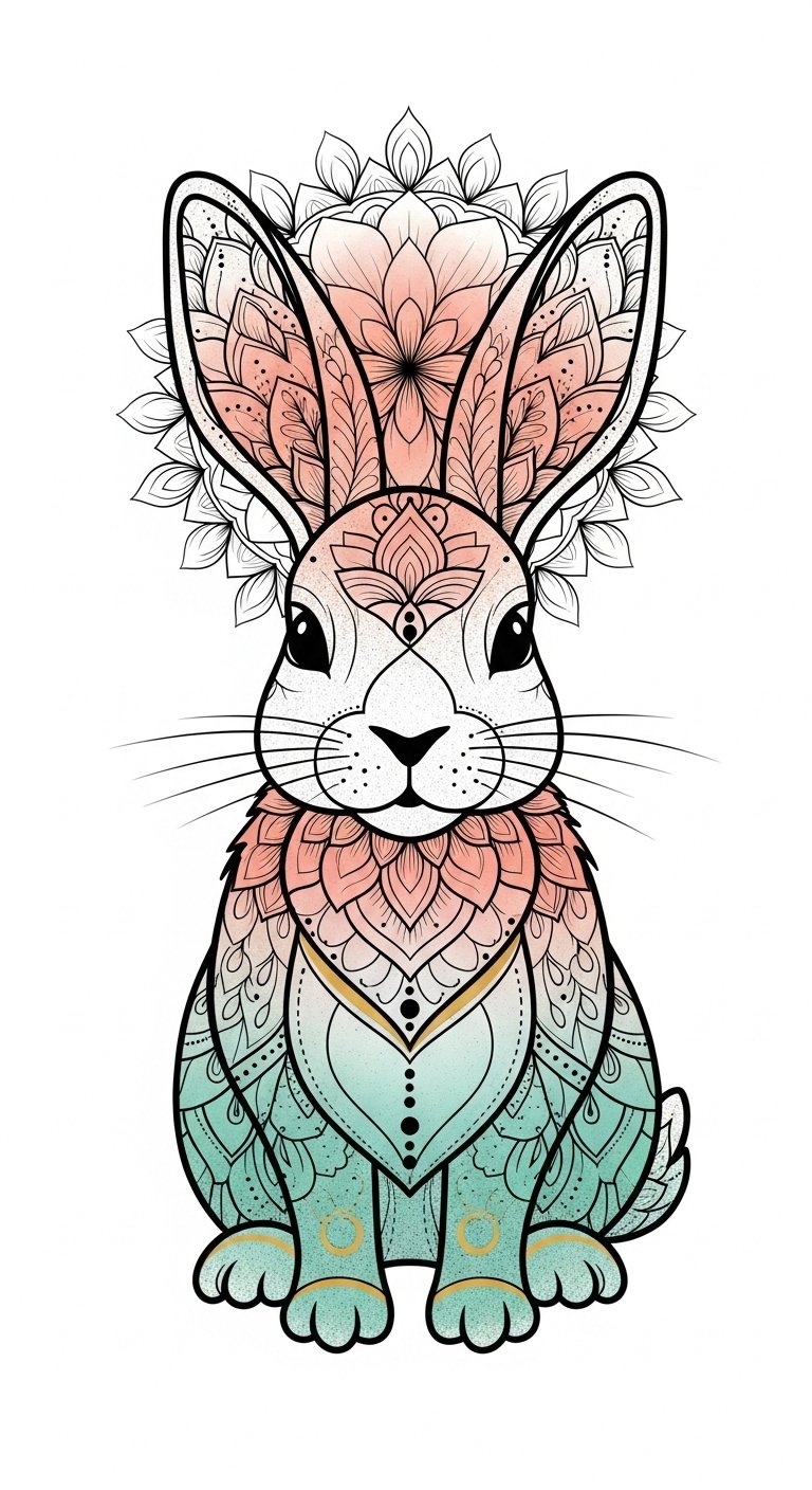 The design symbolizes fertility, intuition, and renewal through the rabbit motif while the mandala elements represent unity, balance, and inner focus; emotionally it can convey gentle protection or playful wisdom.